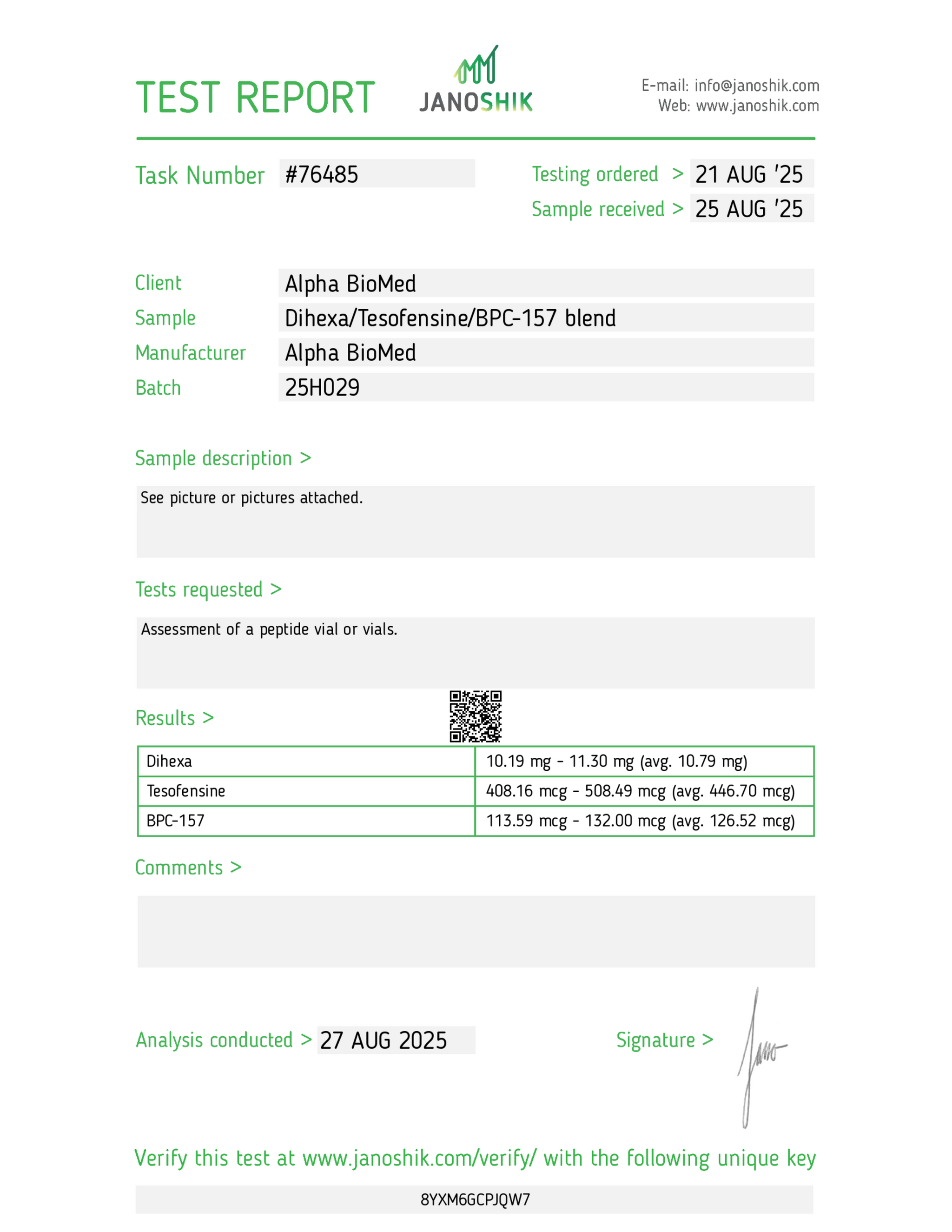 Every Peptagon peptide is manufactured in USA cGMP-certified facilities, tested by independent third-party labs, and shipped with a full Certificate of Analysis. 99%+ purity, no exceptions.